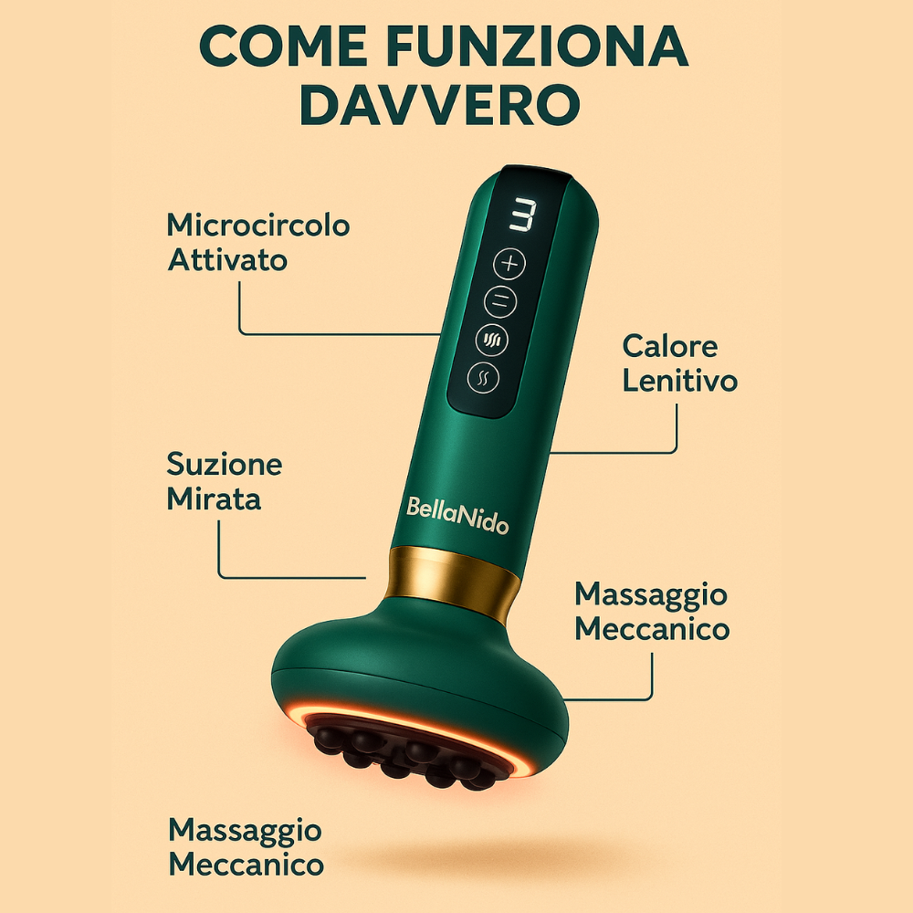 Il massaggiatore anticellulite Bella Nido® utilizza tecnologie di massaggio avanzate, come la terapia di aspirazione e il riscaldamento a infrarossi, per ridurre la comparsa di cellulite, smagliature e altri segni di invecchiamento. Stimola la circolazione sanguigna, scompone i depositi di grasso e migliora la consistenza della pelle per un aspetto più liscio e tonico.